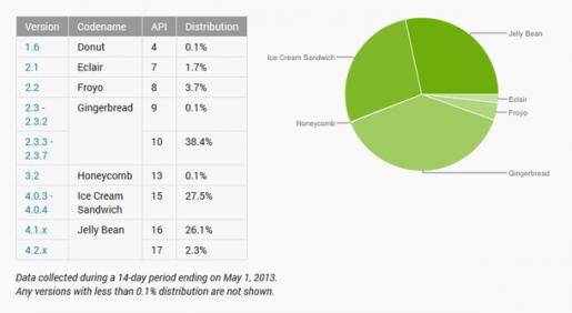 Bij Android daarentegen zijn er nog veel verschillende versies die lopen op de Gingerbread (Versie 2.3). Alhoewel deze reeds twee jaar oud is, loopt deze nog steeds op 38% van de Android-tablets.