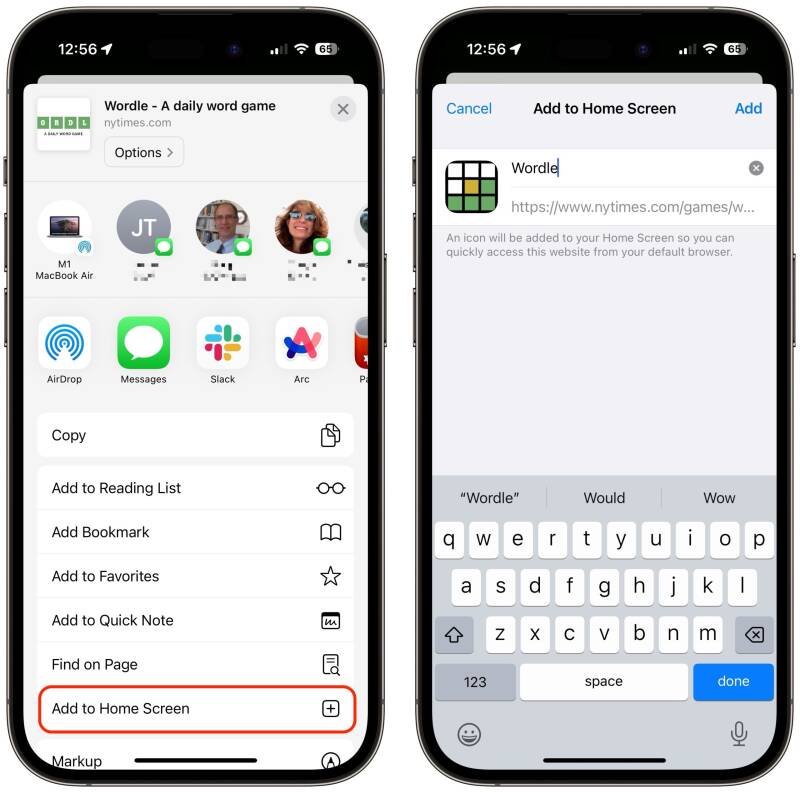 - Het toegankelijker maken van Wordle, of een willekeurige andere website, is eenvoudig: zet hem op het beginscherm. Om dat te doen ga je in Safari naar de betreffende pagina, en tik je op het delen-icoontje, en dan op 'Zet op beginscherm'. Op het volgende scherm kun je het gevormde icoontje een naam geven (houd het kort) en tik je op Add. Voor het geval van Wordle is er overigens ook NYT Games, een app waar Wordle ook in zit.