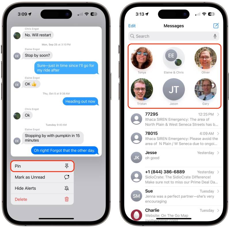 Voor Berichten: vraag met wie het meest ge-sms't wordt. Tik op een gesprek en houd vast, en tik vervolgens op "Maak vast" in het menu dat verschijnt. Nu staat er voor dit gesprek een icoon bovenin het venster, waardoor het makkelijker te vinden is dan als je steeds langs alle gesprekken naar beneden moet scrollen. De gepinde status wordt over verschillende apparaten gesynchroniseerd via iCloud, als ook met een Mac of iPad gewerkt wordt.