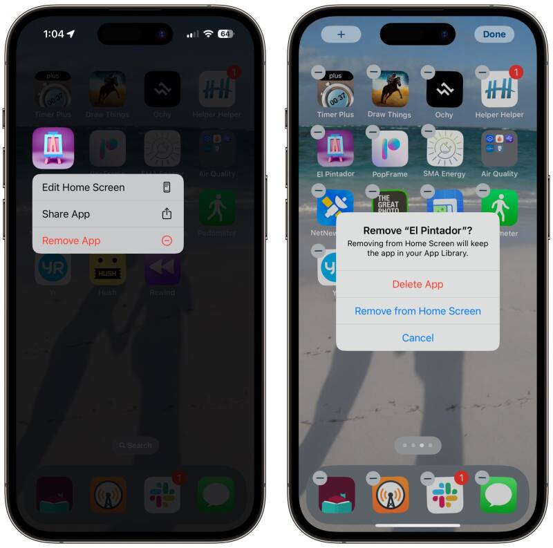 Tik op een app en houd hem vast om een popover tevoorschijn te halen waarin je 'Verwijder app' kunt kiezen. Je kunt ook een lege plek op een beginscherm aanraken en vasthouden om naar de wiebelmodus te gaan, waarna je een icoontje kunt selecteren om diezelfde popover te tonen. Ik beschreef instructies om in één keer meerdere apps naar de app-bibliotheek te verplaatsen in “iPhone-startscherm-apps groepsgewijs beheren met de app-bibliotheek van iOS 14” (19 april 2021).