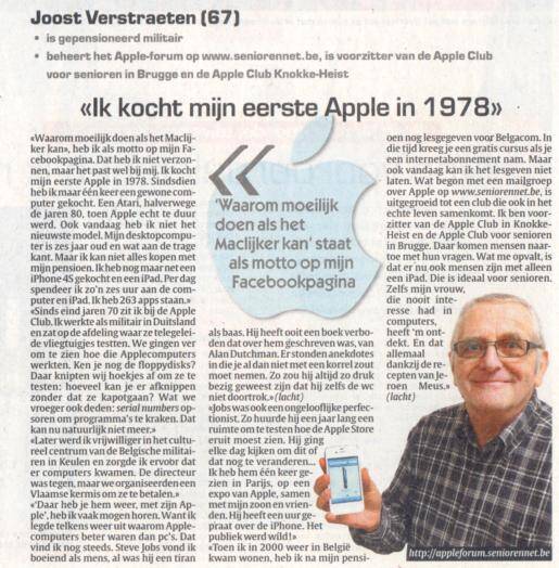“‘Waarom moeilijk doen als het Maclijker kan’, heb ik als motto op mijn Facebookpagina. Dat heb ik niet zelf verzonnen, maar het past wel bij mij. Ik kocht mijn eerste Applecomputer in 1978. Sindsdien heb ik maar één keer een computer gekocht die geen Apple was. Een Atari, halverwege de jaren tachtig, toen Apple echt te duur werd. Ook vandaag heb ik niet het allernieuwste model. Mijn desktopcomputer is zeven jaar oud en is nu wat aan de trage kant. Maar ik kan niet alles kopen met mijn bescheiden wedde van gepensioneerde. Ik heb trouwens nog maar net een iPhone 4S gekocht en een iPad. Per dag breng ik gemiddeld zes uur door achter de computer en op de iPad. Hoeveel apps er op staan, weet ik niet precies. Sommige heb ik er weer afgegooid, maar in totaal heb ik er 263.”