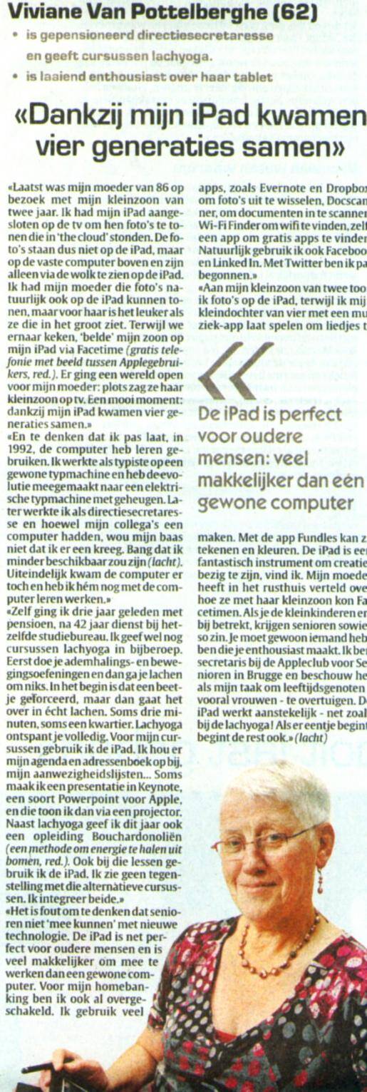 Blijkbaar heeft deze Ann-Marie haar voorbereidend huiswerk goed gedaan. Zij heeft ons Apple forum doorzocht en kwam terecht bij onze ASB. Zo ook is Viviane Van Pottelberghe (vivapo) haar opgevallen met haar bericht over de iPad, gebruikt door vier generaties. Dus ook over haar werd er een artikel geschreven - zij was eveneens één van de vier geïnterviewden.